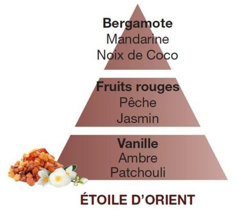 Het Huisparfum Étoile d'Orient is weelderig en vurig. Het sprankelt als een eerste ontmoeting met kokos en bergamot als topnoten, met de sensuele, naar vanille geurende lef van amber en patchouli en de tedere, fruitige hartnoot die achter de geur van rood fruit en jasmijn te ontdekken is.